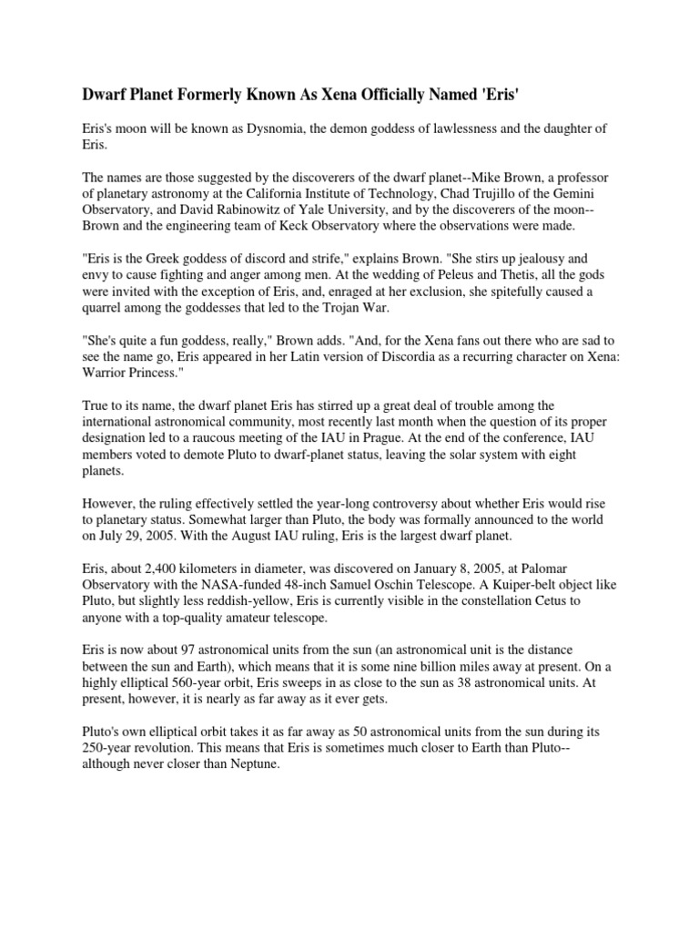 Dwarf Planet Formerly Known As Xena Officially Named Eris PDF Pluto