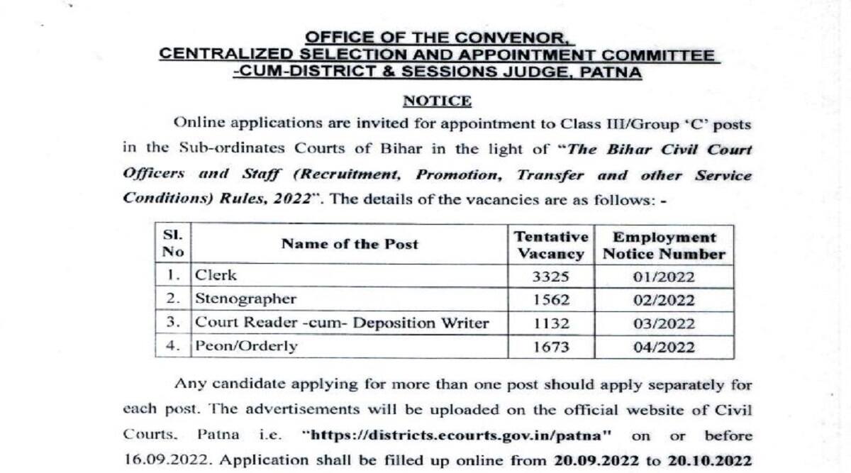 Bihar Court Recruitment 2022 notification for 7692 posts released at