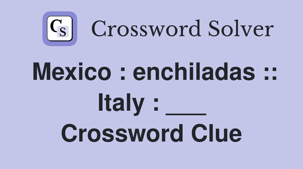 Mexico : enchiladas :: Italy : Crossword Clue Answers Crossword