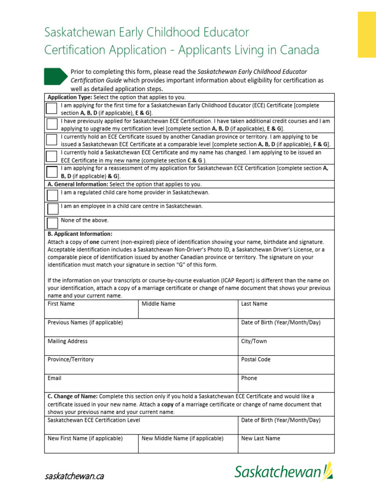 Saskatchewan Early Childhood Educator Certification Application