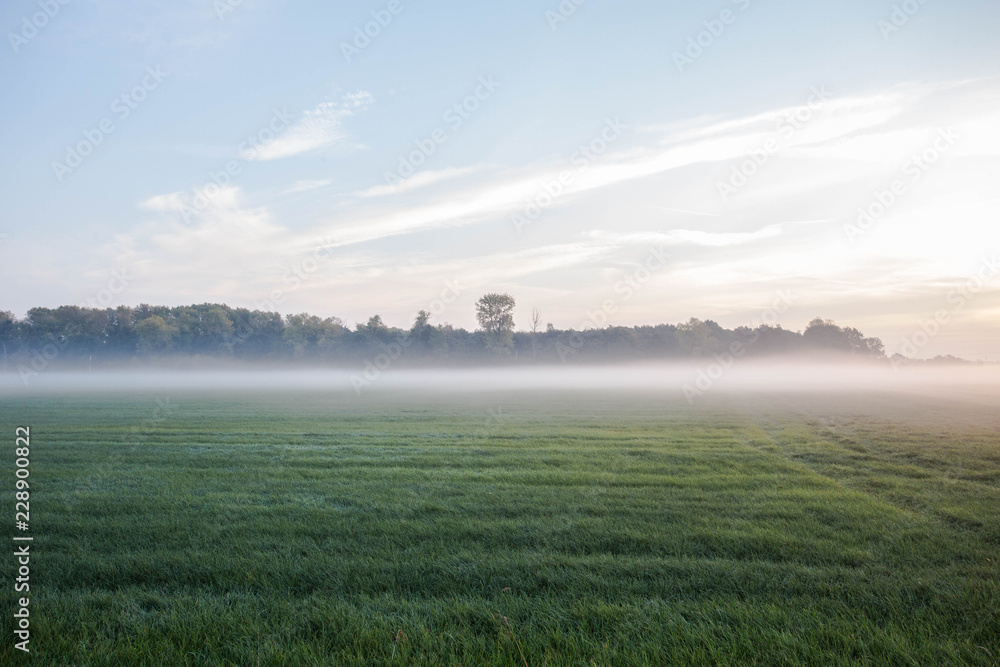 Landscape with Trees in Fog in the Morning Early Summer Morning