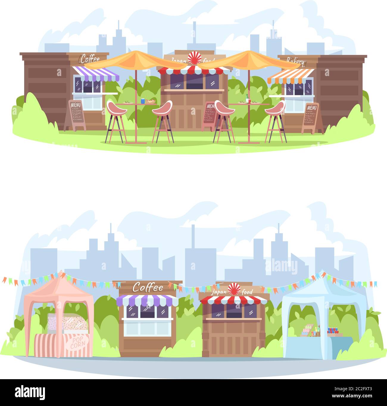 Daytime town food court semi flat vector illustration set Stock Vector