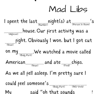 Cheap Sleepover Mad Libs Printable Downloadable Party Game for Kids