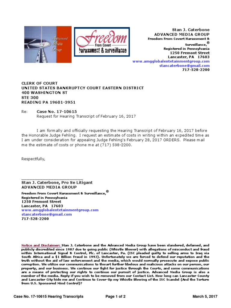 LETTER To Clerk of Court U S Bankruptcy For The Eastern District of