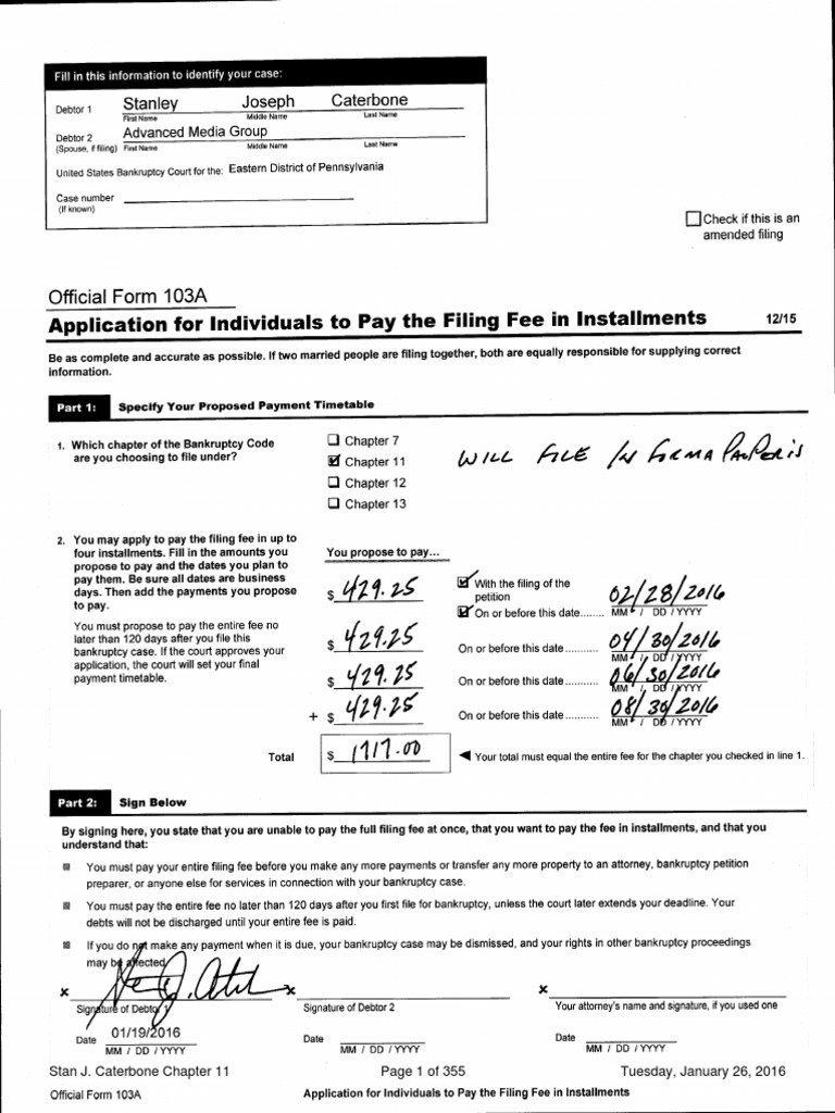 2016 Chapter 11 New Case For Filing in Eastern District of Pennsylvania