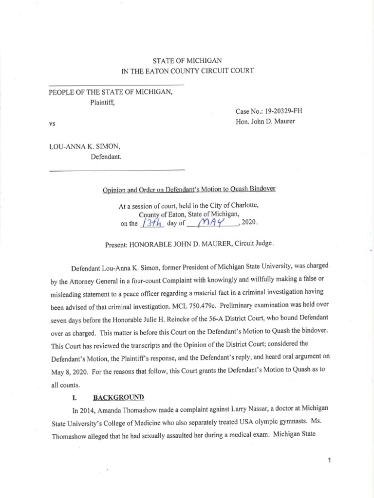 Judge dismisses charges against former MSU President Lou Anna Simon