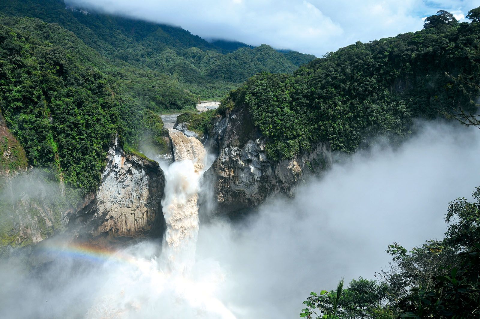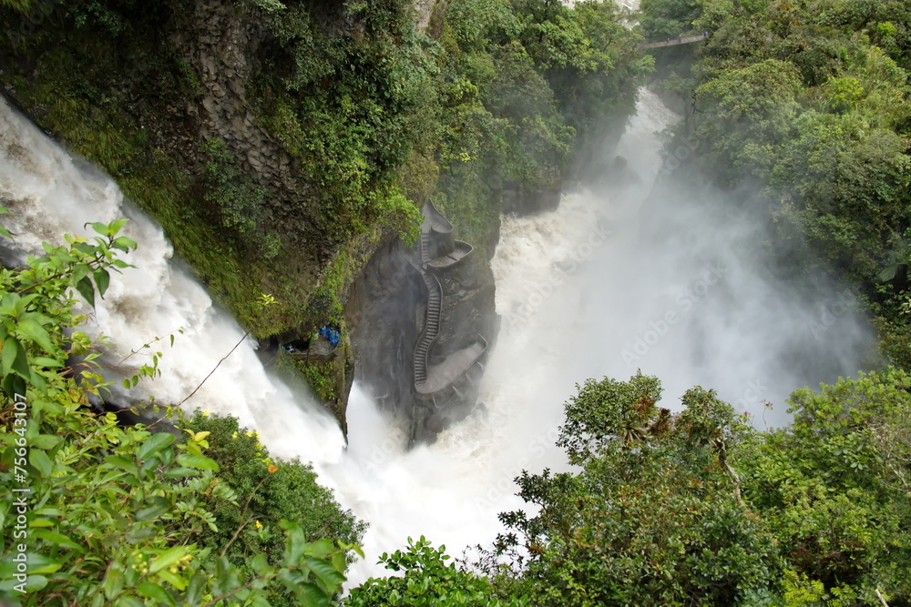 Mist rising off the pool at the base of the Pailon del Diablo waterfall