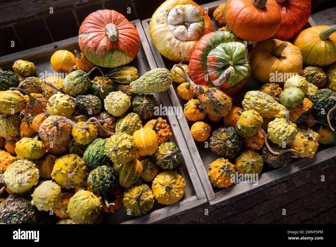 Trays of autumnal produce with edible squash pumpkins Jack o lanterns