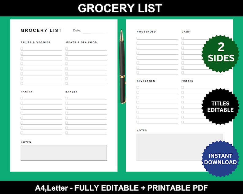 Digital Download Grocery List Printable Fillable PDF Editable Grocery