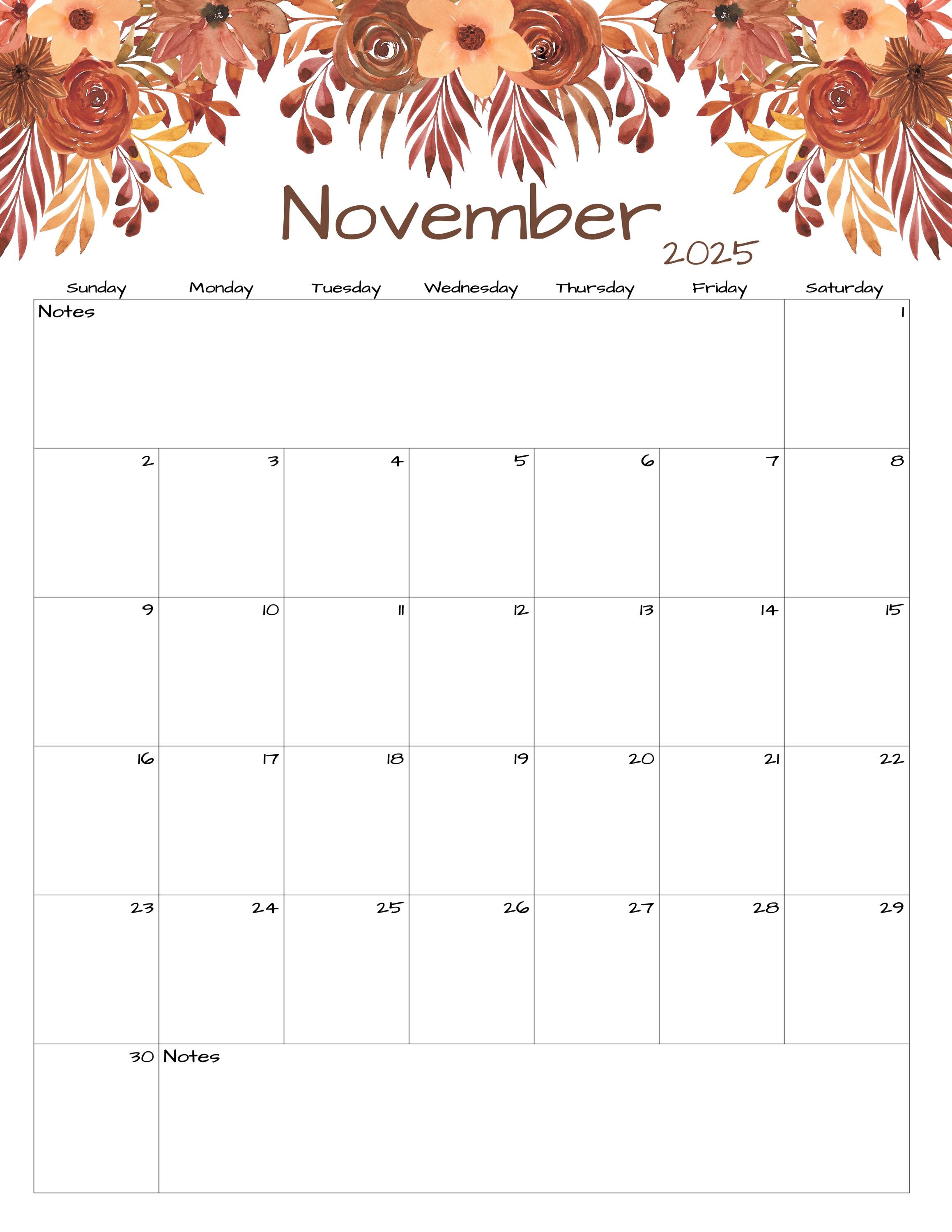 Download Free Editable Calendar November 2025 With Notes weeks start