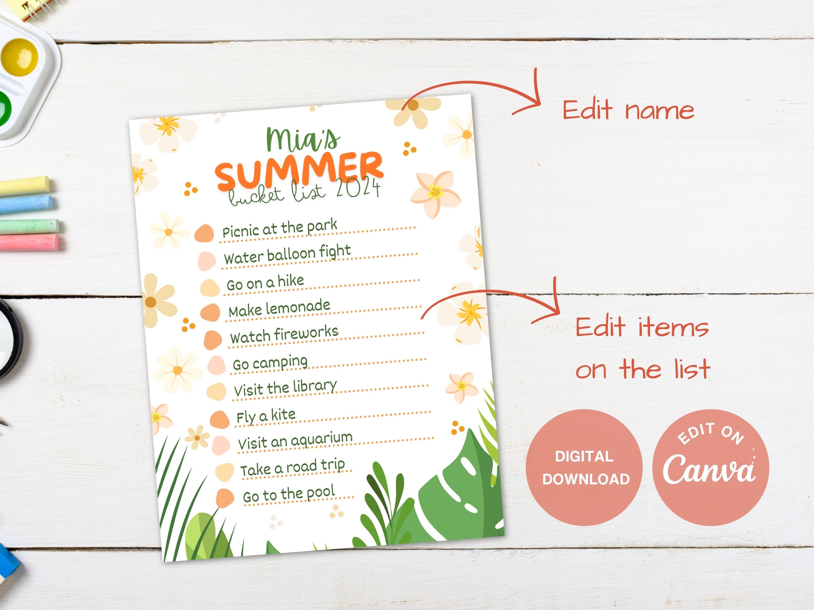 Editable Printable Summer Bucket List Personalized Summer Activity