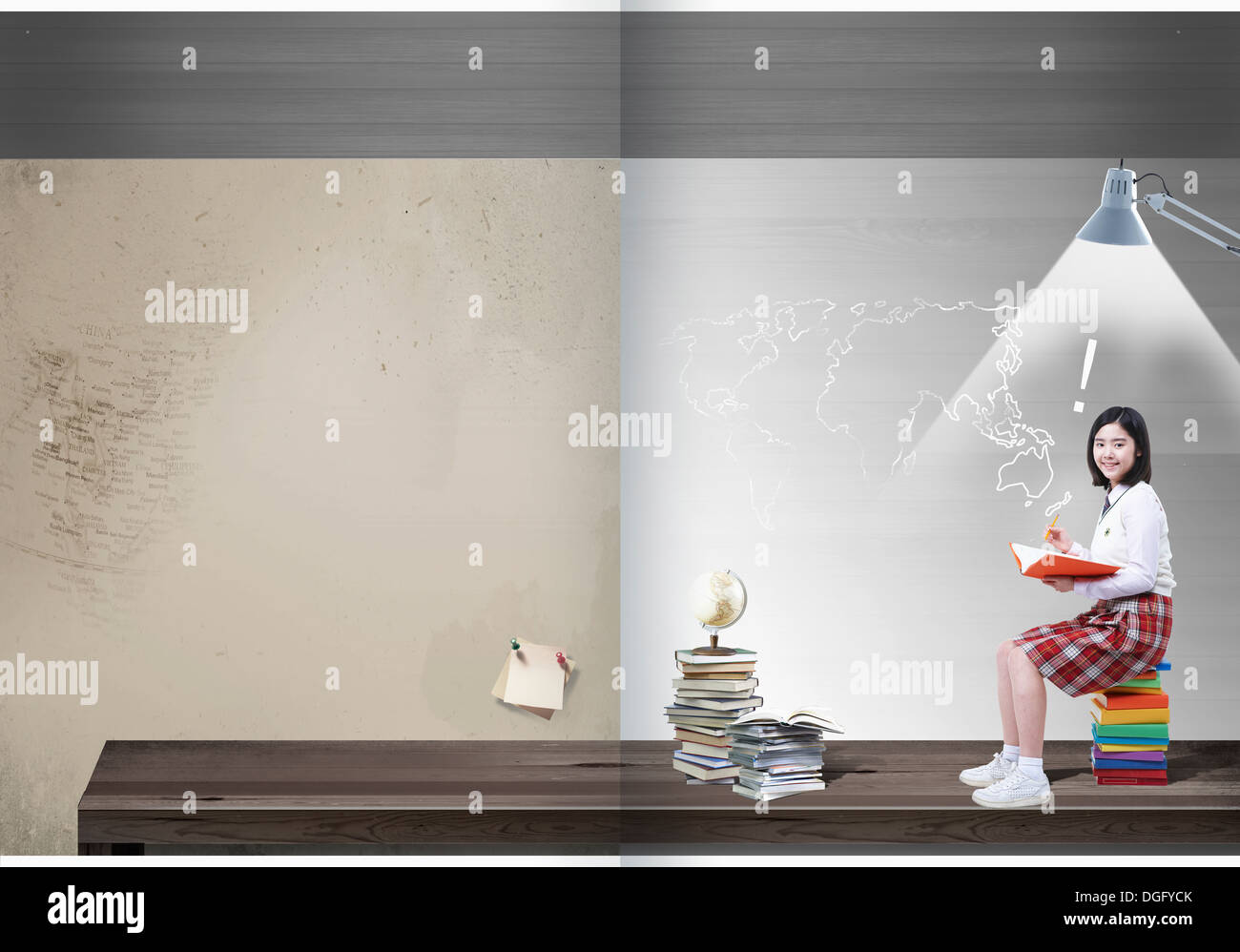 education booklet template featuring a school girl under lamp Stock