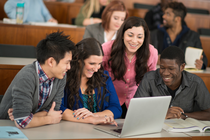 Group of college students using laptop in the classroom Premium AI