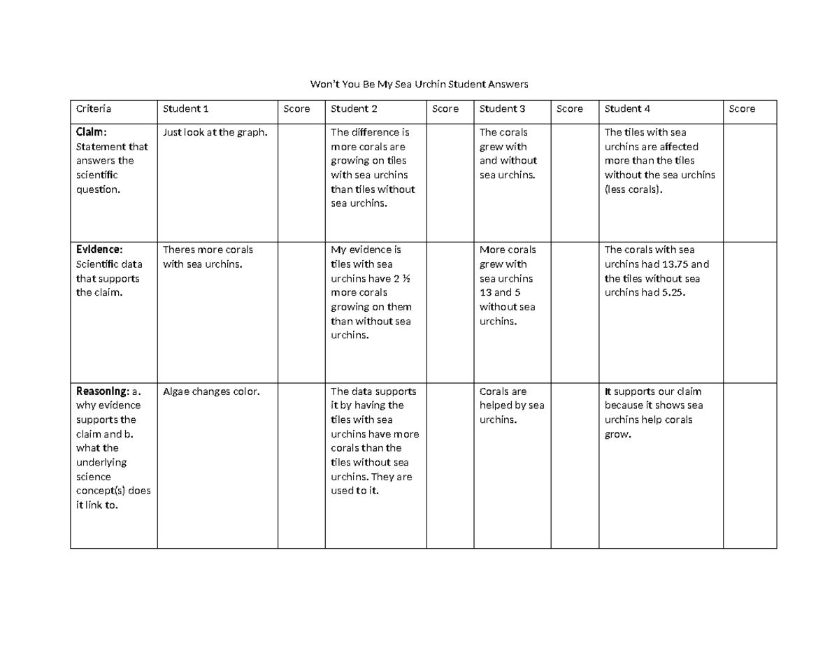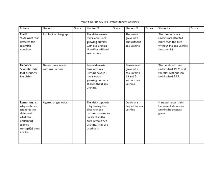 Sea Urchin data nugget student answers PD Won t You Be My Sea Urchin