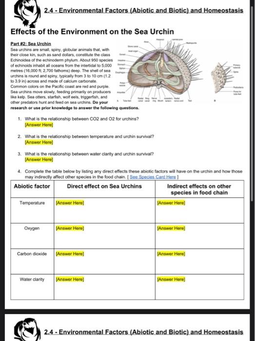 Effects Of The Environment On The Sea Urchin Worksheet Answers