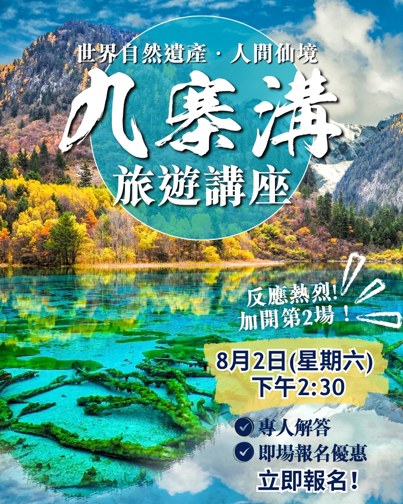 EGL東瀛遊: 熱烈加推 8月2日(本週六)【九寨溝 旅遊講座】解構世界自然遺產x人間仙境 最佳行程及玩法!立即