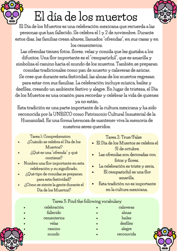 Spanish Worksheet El día de los muertos Teaching Resources