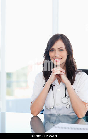 Nurse sitting at the desk with her hands crossed and leaning her head