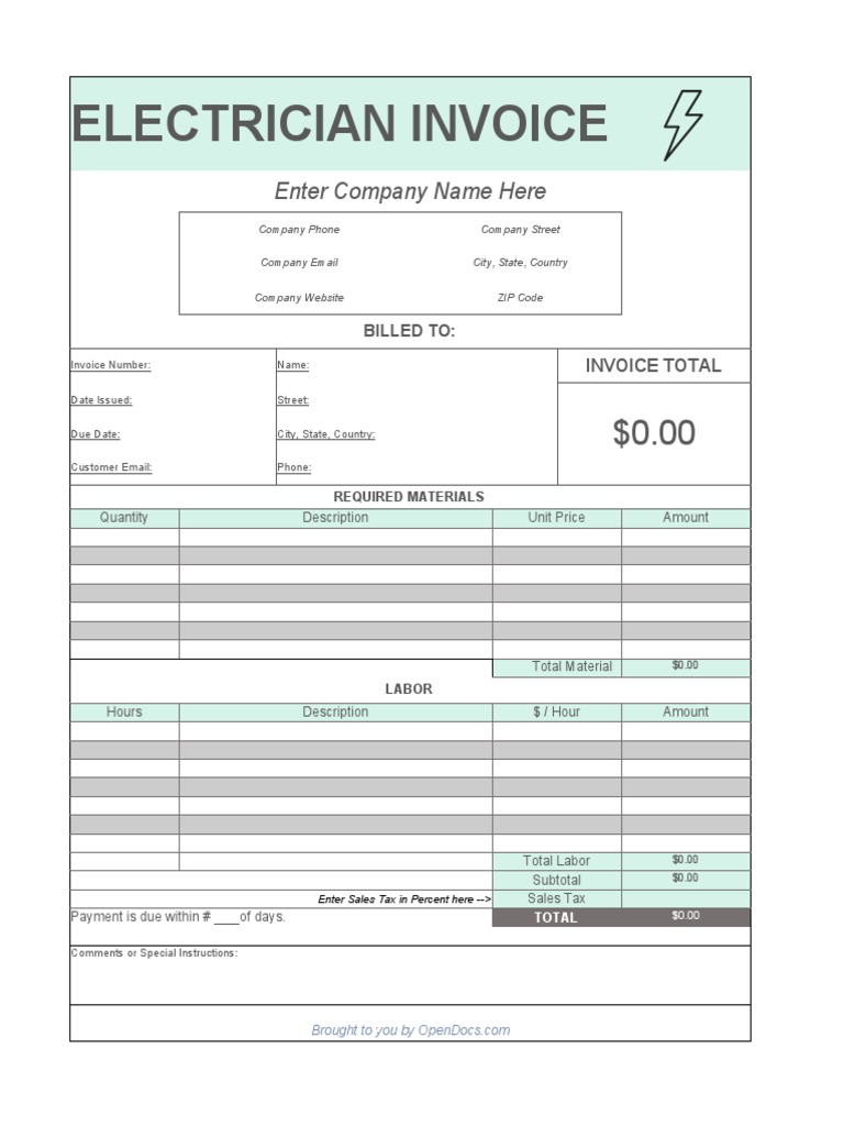 Downloadable Electrical Invoice Template UK Word / Google docs