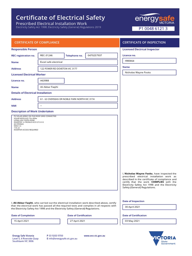 Electrical Certificate of Compliance and Electrical Safety Certificate
