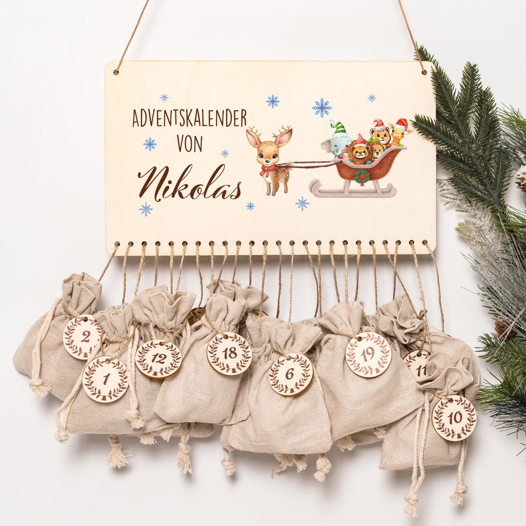 Personalized Advent Calendar Wood Sleigh Reindeer Elephant Advent