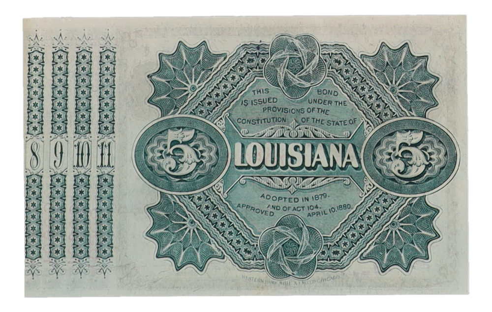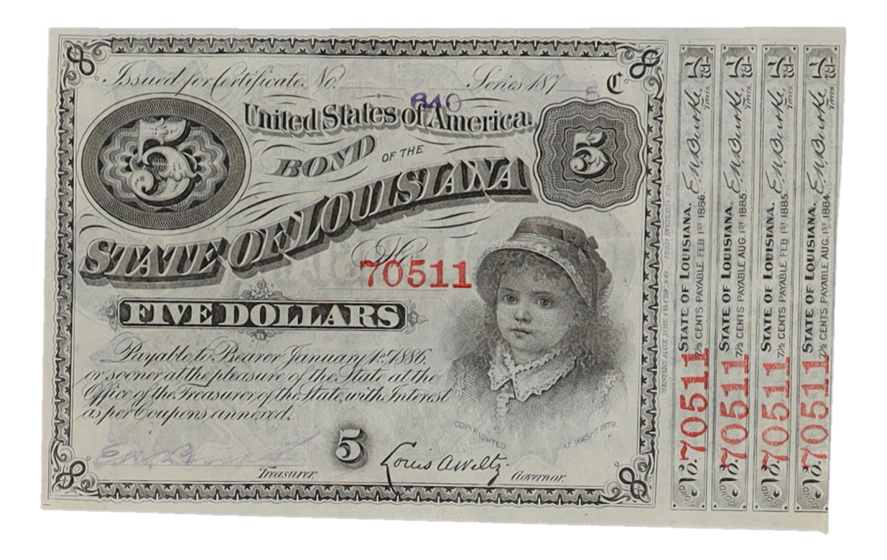 1875 Louisiana $5 Baby Bond Certificate Pristine Auction