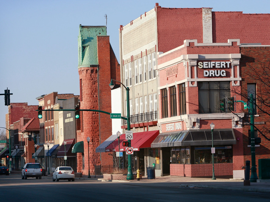 Shops in historic buildings on Main Street in downtown Elkhart Indiana
