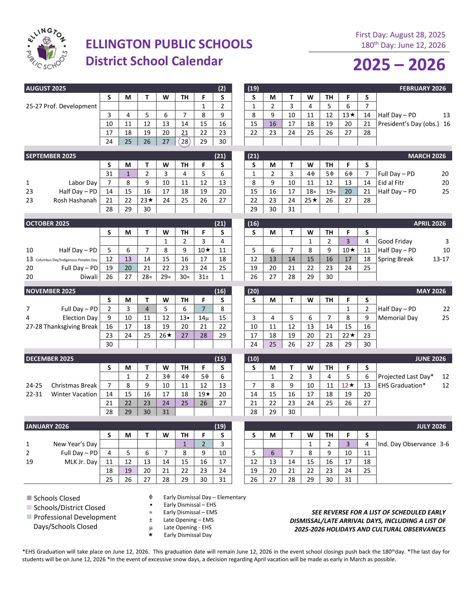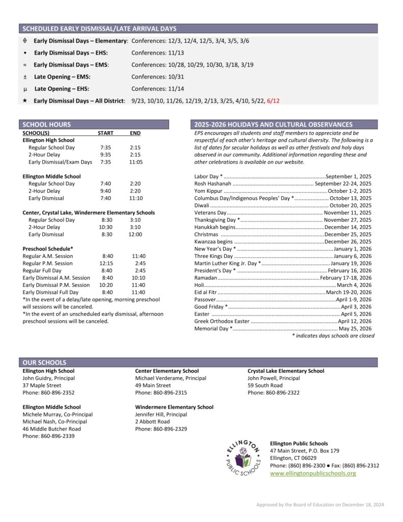 Ellington Public Schools Calendar