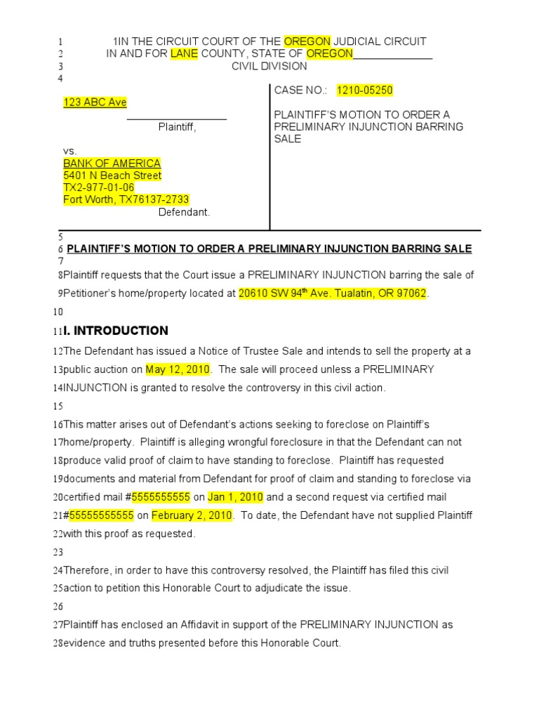 007 Motion for Preliminary Injunction Foreclosure Injunction