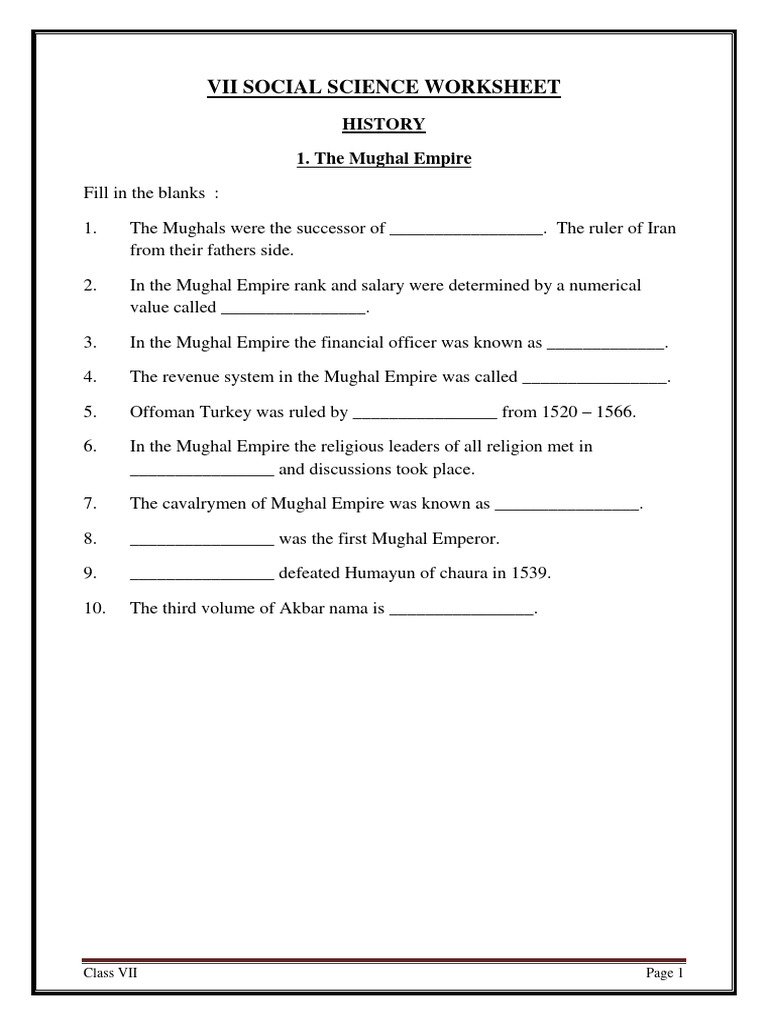 CBSE 7th Social Science History Worksheet The Mughal Empire PDF