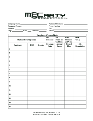 Fillable Online Employee Census Data bmccartyinsuranceincbbcomb Fax