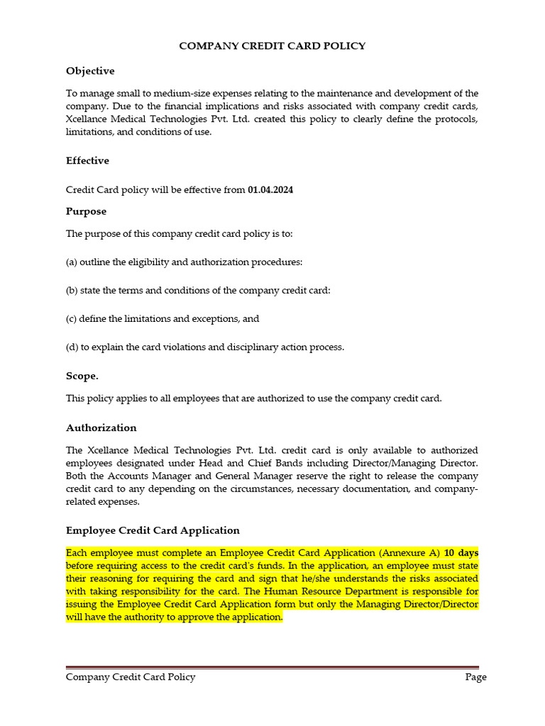 Sample Company Credit Card Usage Policy Download Free PDF Credit