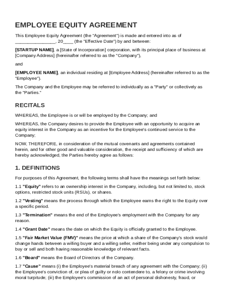 Startup Employee Equity Agreement Template Google Docs Word PDF