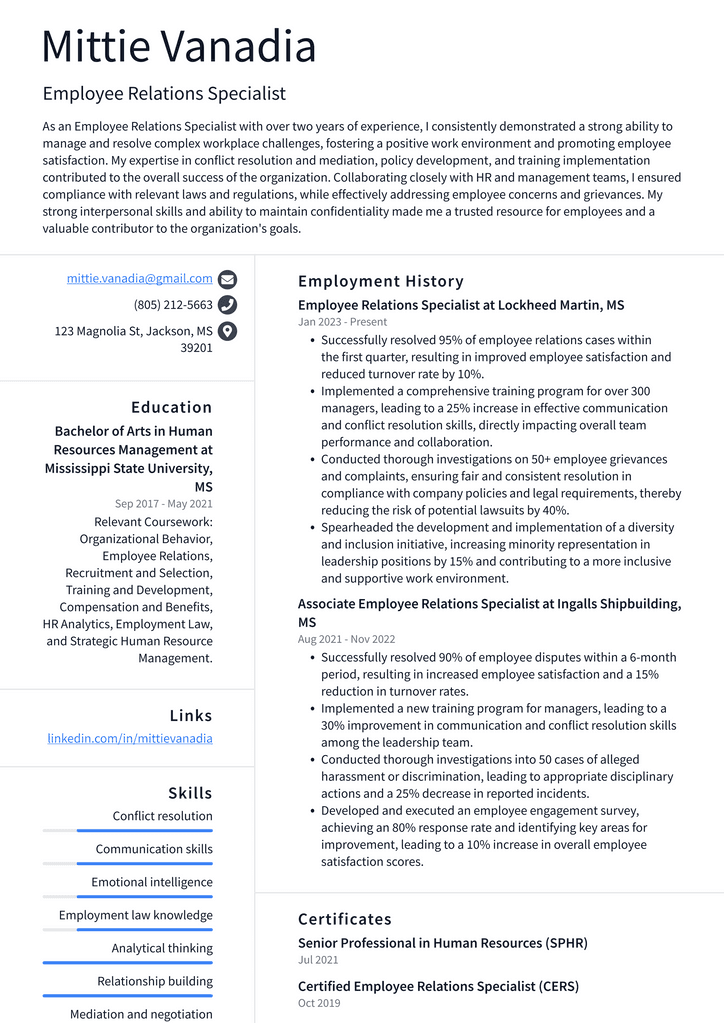 2023 Employee Relations Resume Example ( Guidance) TealHQ