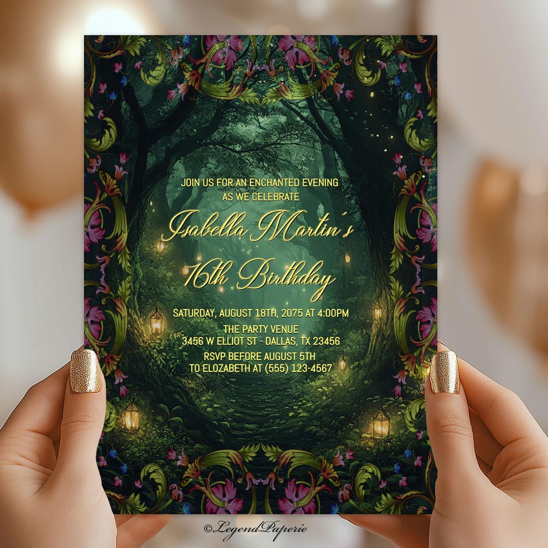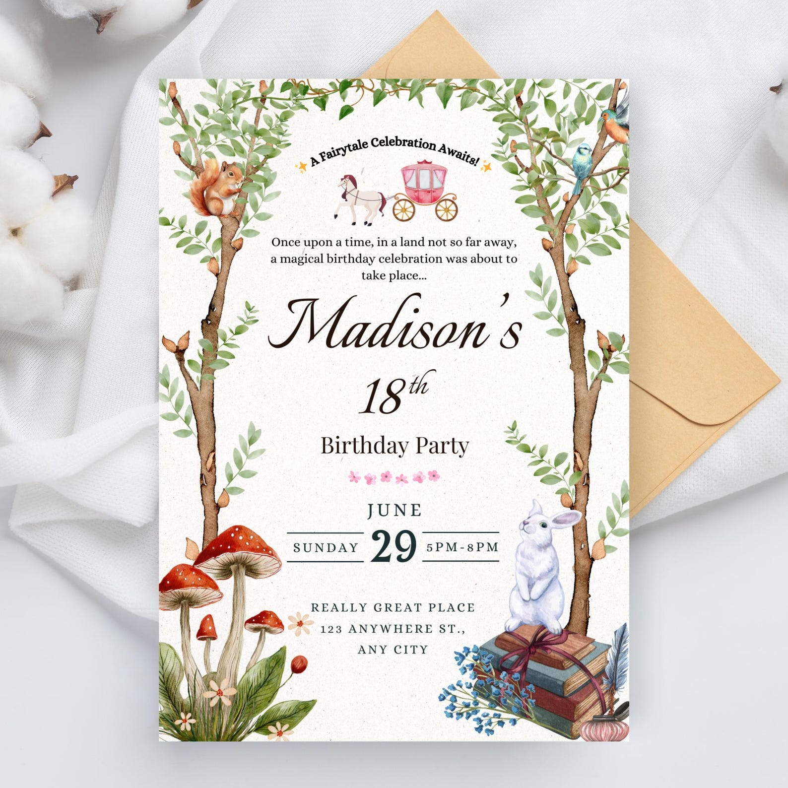 Editable Digital Enchanted Forest Birthday Invitation with Floral and