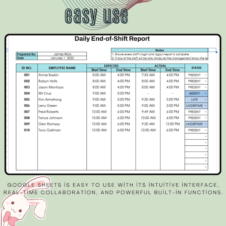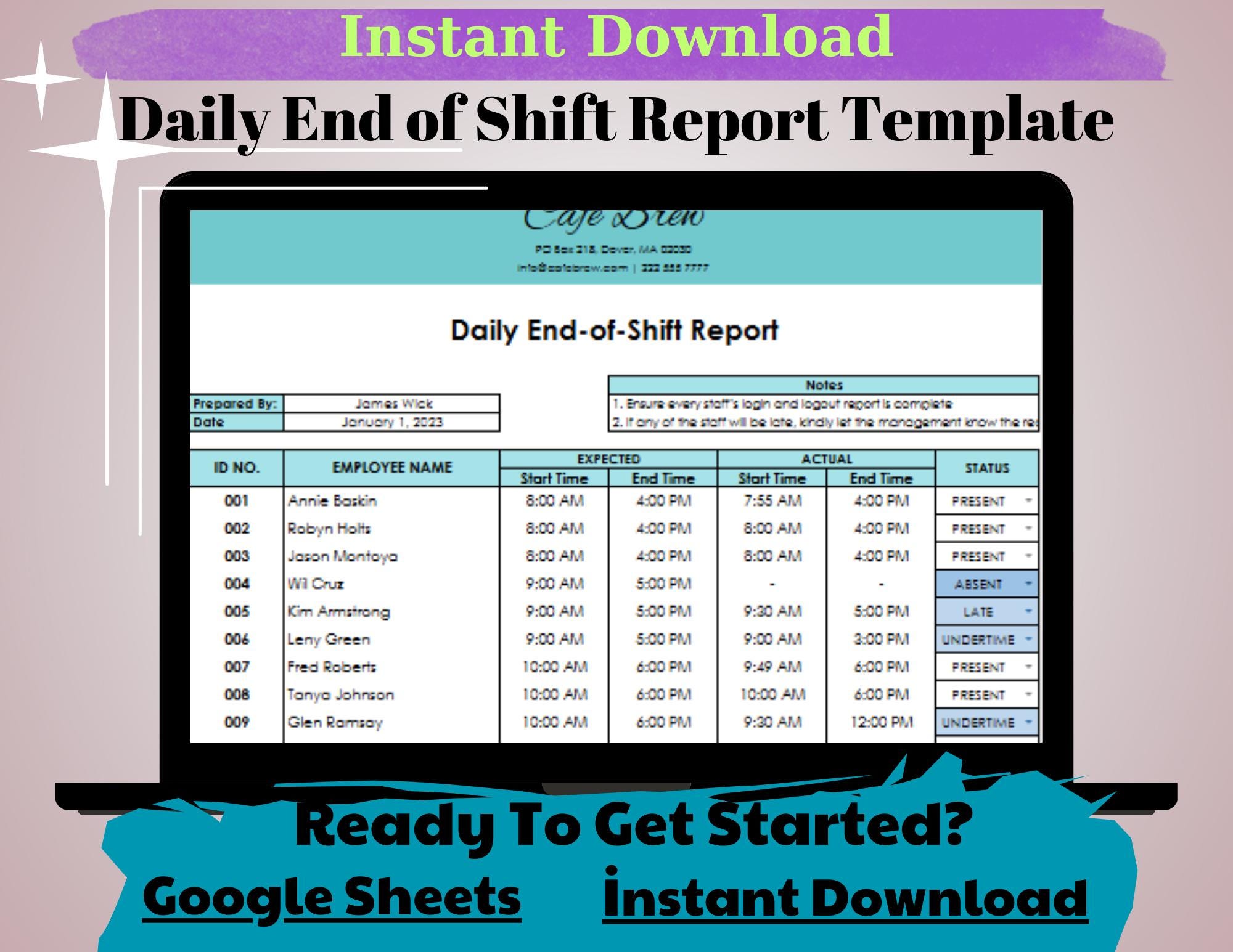 Daily End of Shift Report Template Editable Google Sheets Digital
