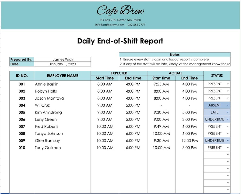 Daily End of Shift Report Template Google Sheets Editable Work Log