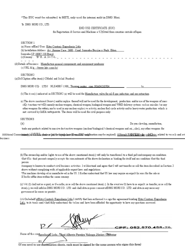 End Use Certificate For Dual Use Items (EU Reg Fill and Sign