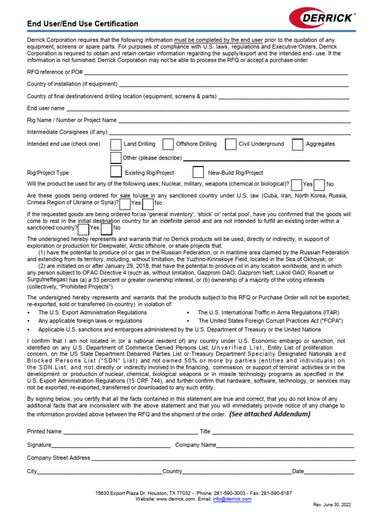 Derrick Corporation HR REGIONS End User End Use Certification 06 30 22