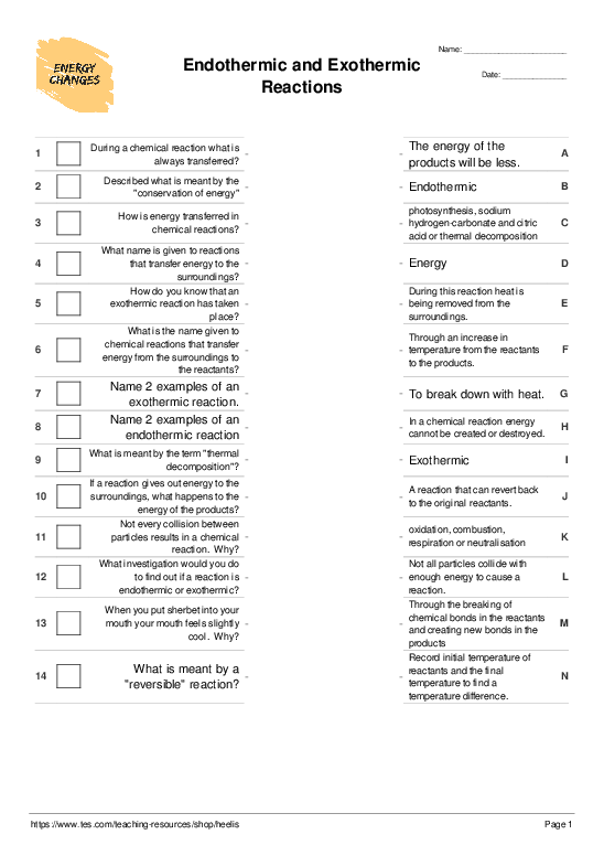 Endothermic exothermic worksheet KS3 Chemistry Teachit Worksheets Library