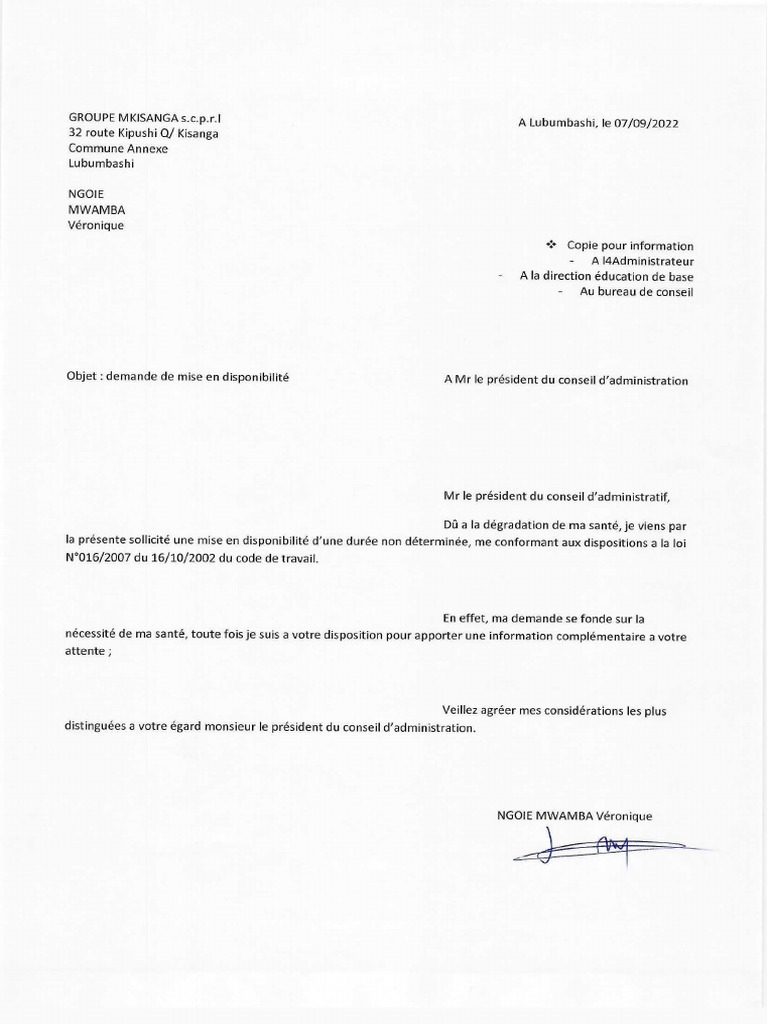 Lettre Mise en Disponibilité PDF