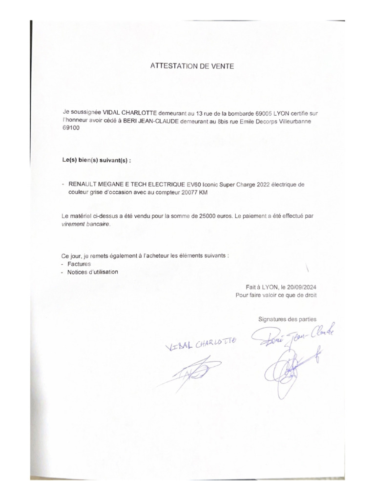 Attestation de Vente PDF