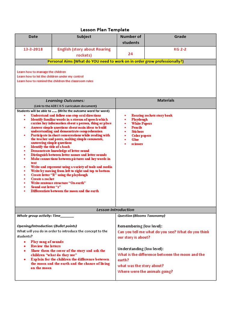 Lesson Plan Template English Leson plan for a class LESSON PLAN