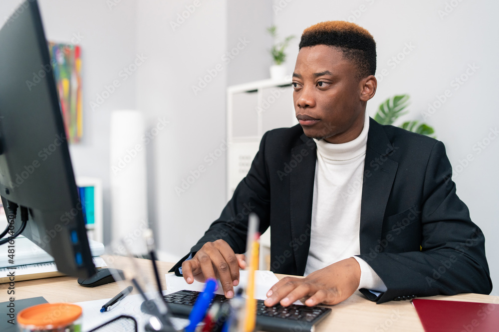 Elegant man working in an office law firm boy sits behind desk in