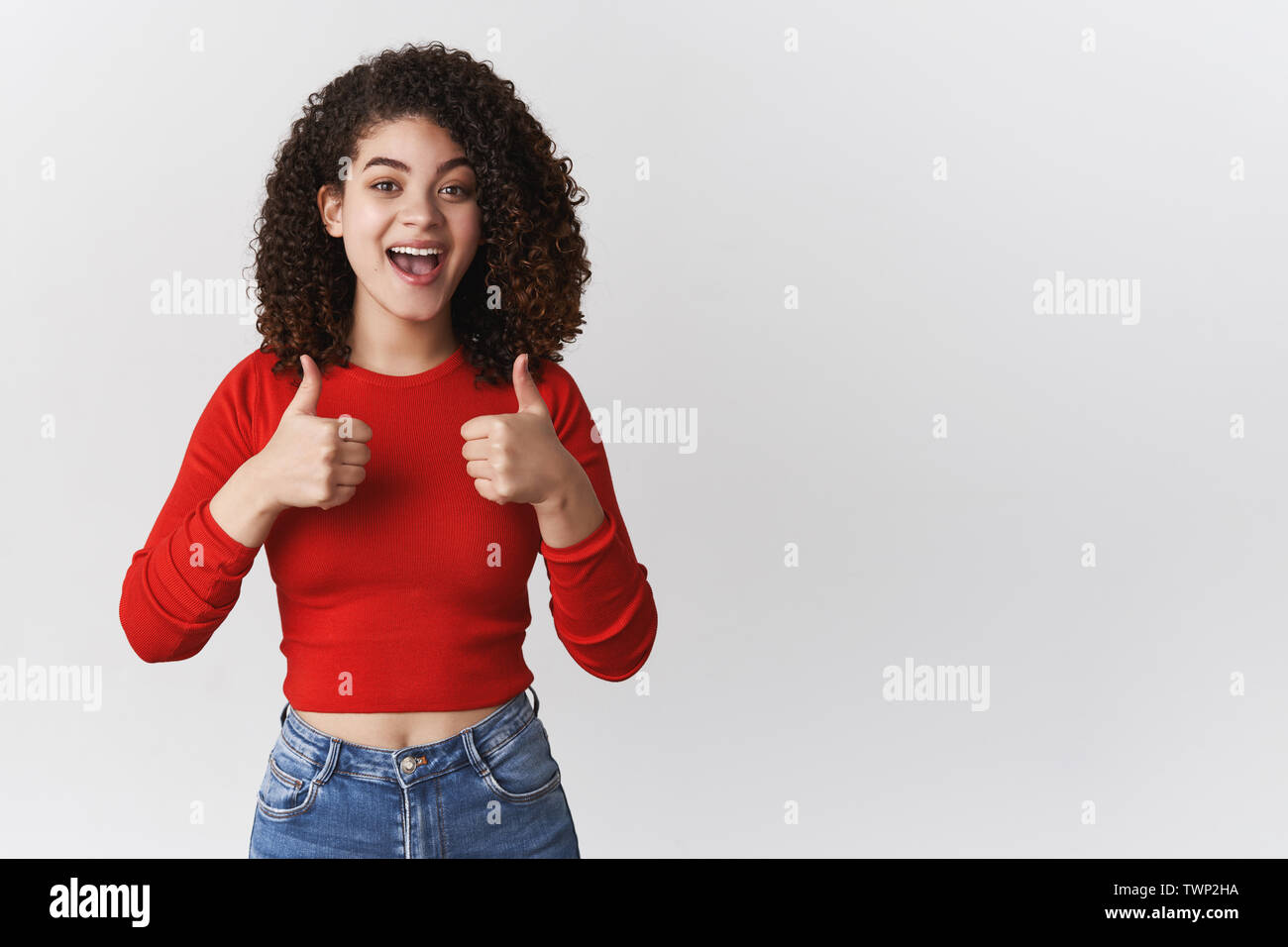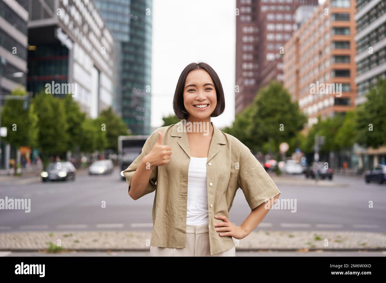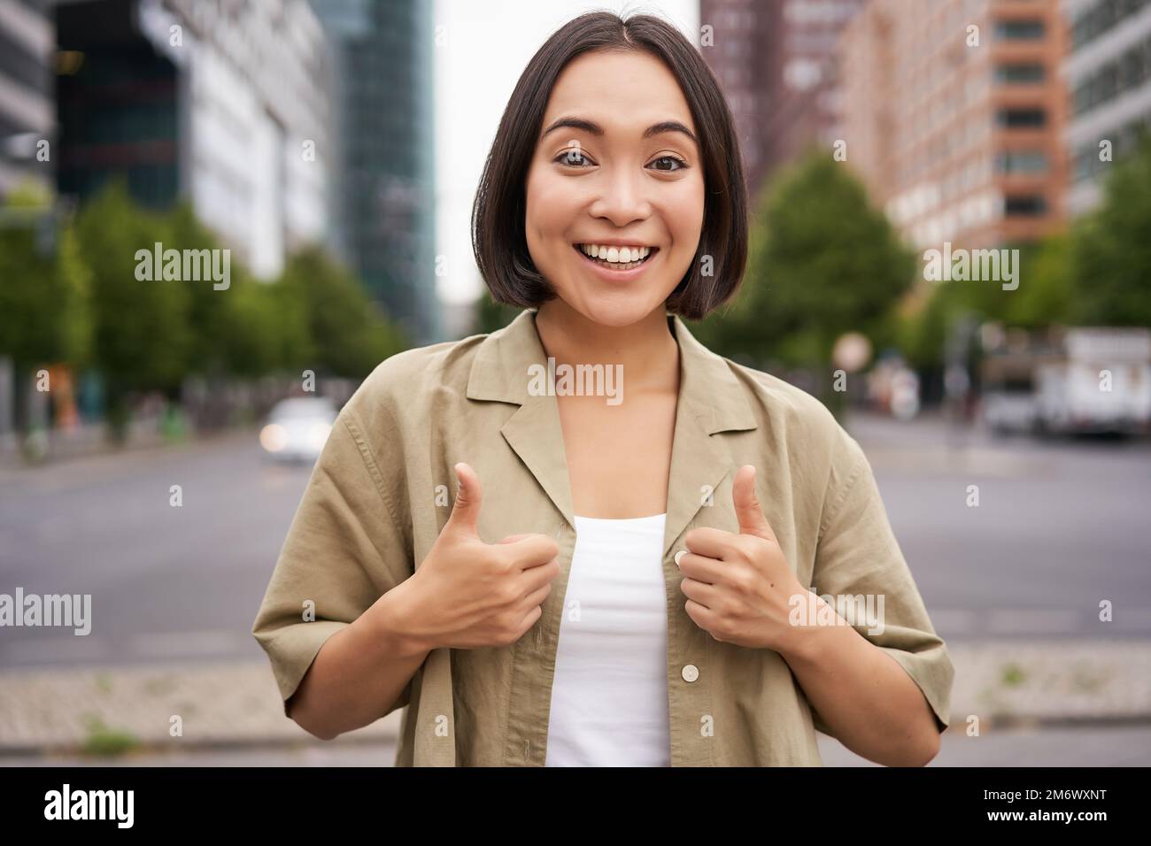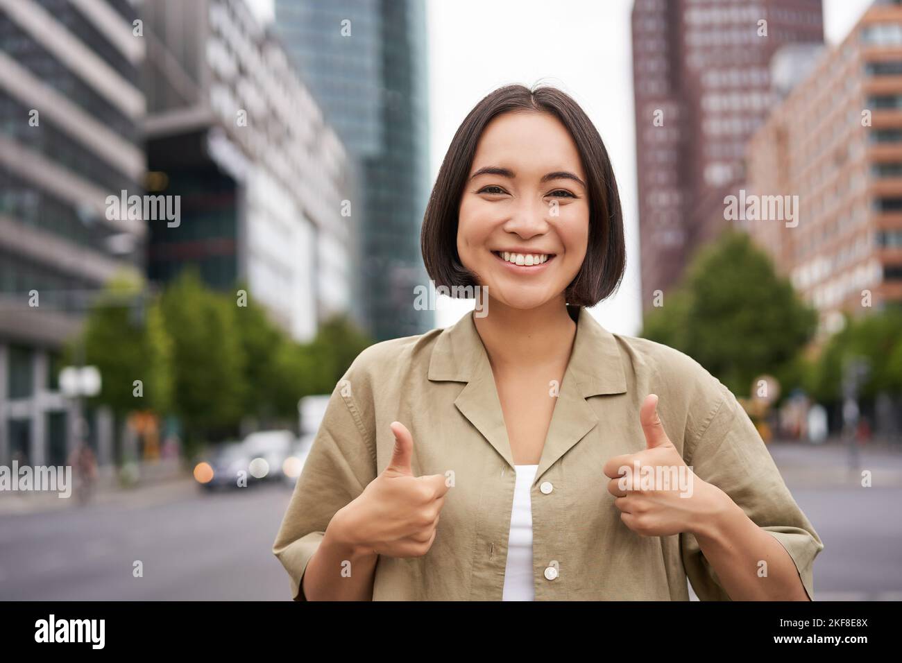 Enthusiastic city girl shows thumbs up in approval looking upbeat