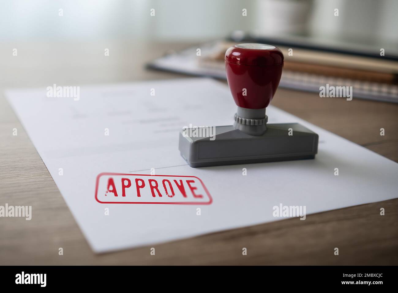 man stamping approval Text is approved by stamping the document on