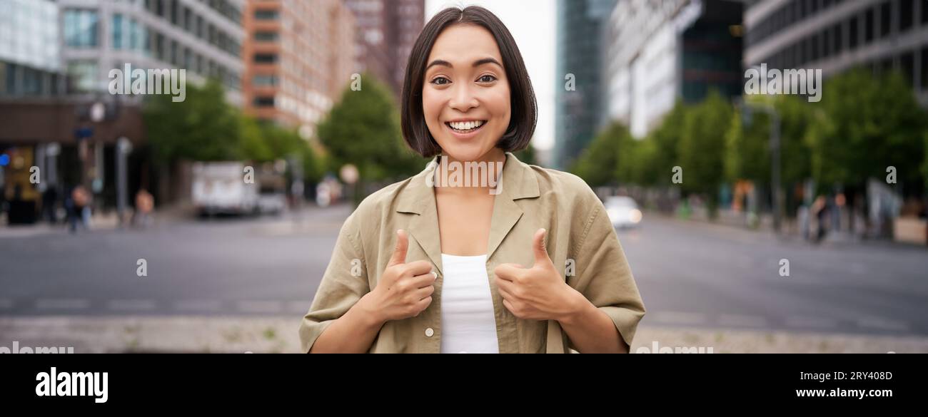 Enthusiastic asian woman shows thumbs up in approval looking upbeat
