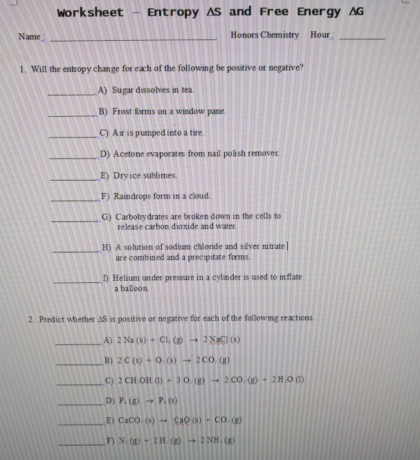 Solved Worksheet Entropy AS and Free Energy AG Name Honors Chegg com