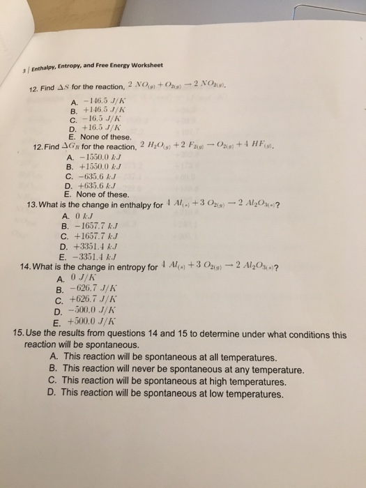 Solved 3 Entholpy Entropy and Free Energy Worksheet 12 Chegg com