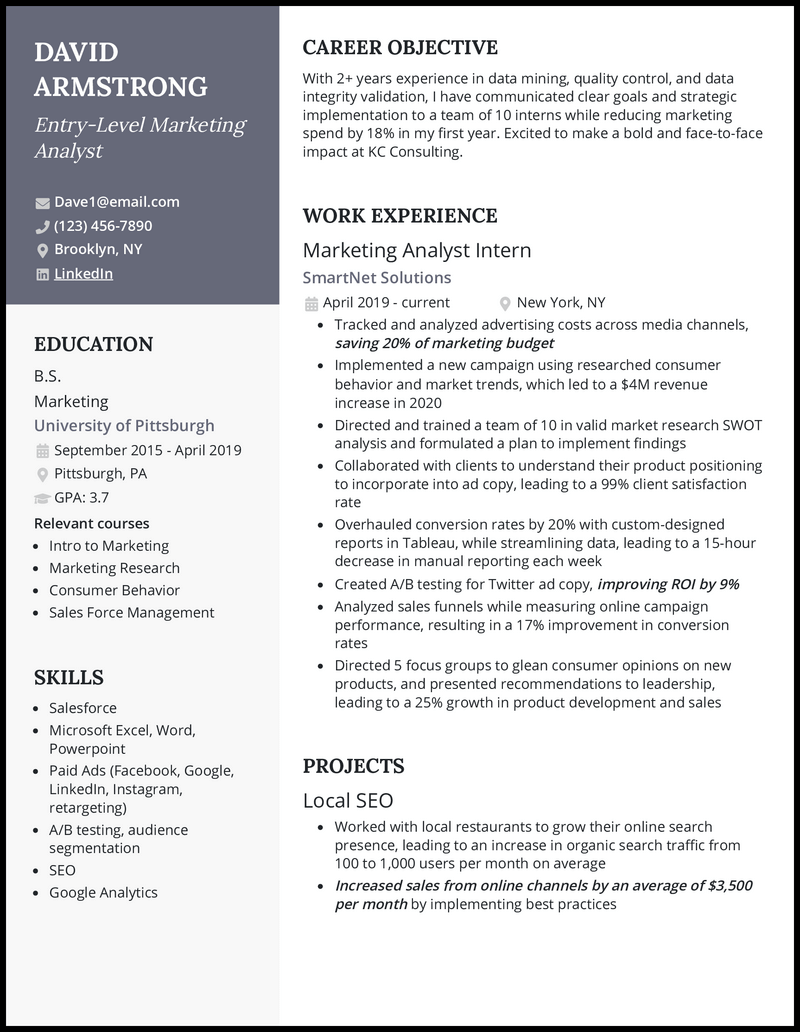 Entry Level Marketing Resume Recent Graduate Internship Experience